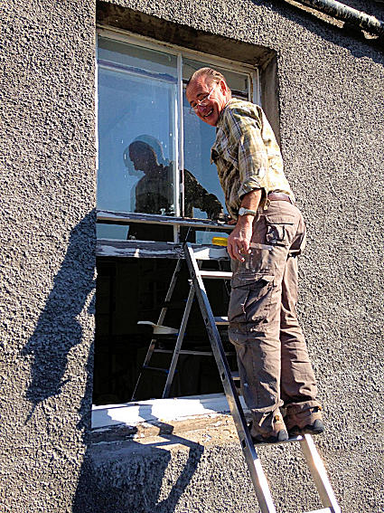 Bro Ramsay Dewar PM, our resident joiner, fits a new pane of glass to the kitchen window